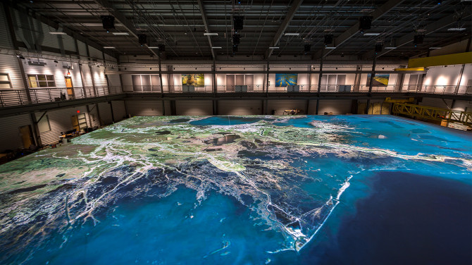 “It was a total team effort,” exclaims Rideau, whose team at IES was contracted to do the projection system design and installation. A total of 20 Christie Roadster WU20K-J projectors were hung from the rafters above the model. For processing and show control, IES integrated Christie Mystique and Christie Pandoras Box.