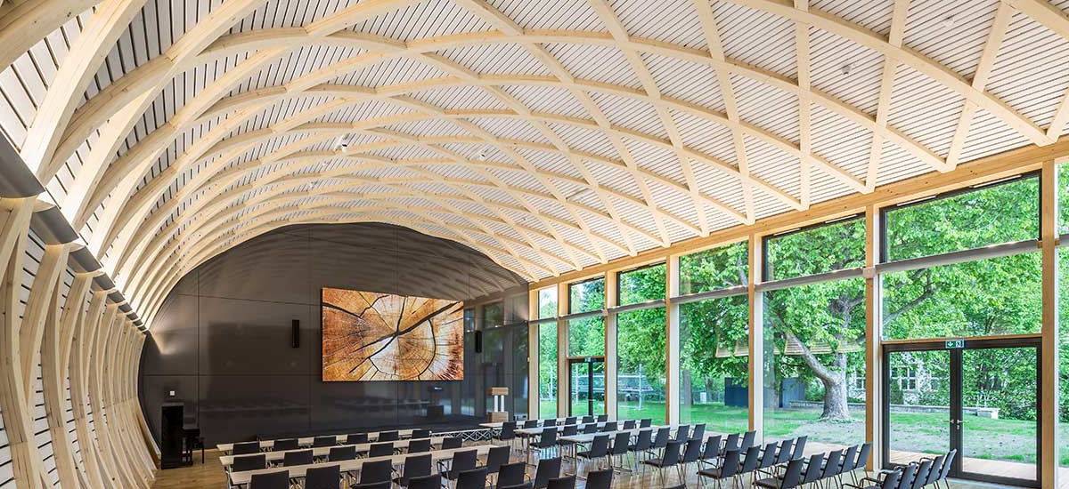 At the Institut für Holztechnologie (IHD) in Dresden, everything is centred on wood and wood technology: So it's little wonder that this versatile raw material played the starring role in the design of the new conference centre with its large auditorium. Light is another element used, flooding in through huge windows and doors and creating a pleasant, warm space in combination with the vaulted spruce ceiling. However, the room concept with no curtains or blinds is a real challenge for the AV technology.