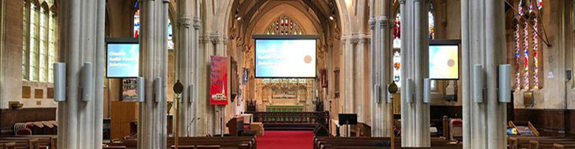 At St James’ Trowbridge, CAVS was tasked with integrating modern AV technology into the traditional parish church which dates back to the 15th century. Three Christie projectors were used to project onto three screens to the left, right and centre of the grade 1 listed building. All screens have been winched to allow them to be hidden behind the building’s arches when not in use. Projector screens are used for displaying hymn lyrics, still images, video, and even live footage from the church to magnify the image for those sat far away. All operating equipment is housed within a bespoke console – utilising old pews to blend into the Church’s décor. An HD motorised camera with recording and streaming capability was also installed to capture services and events and to provide long term system development potential.