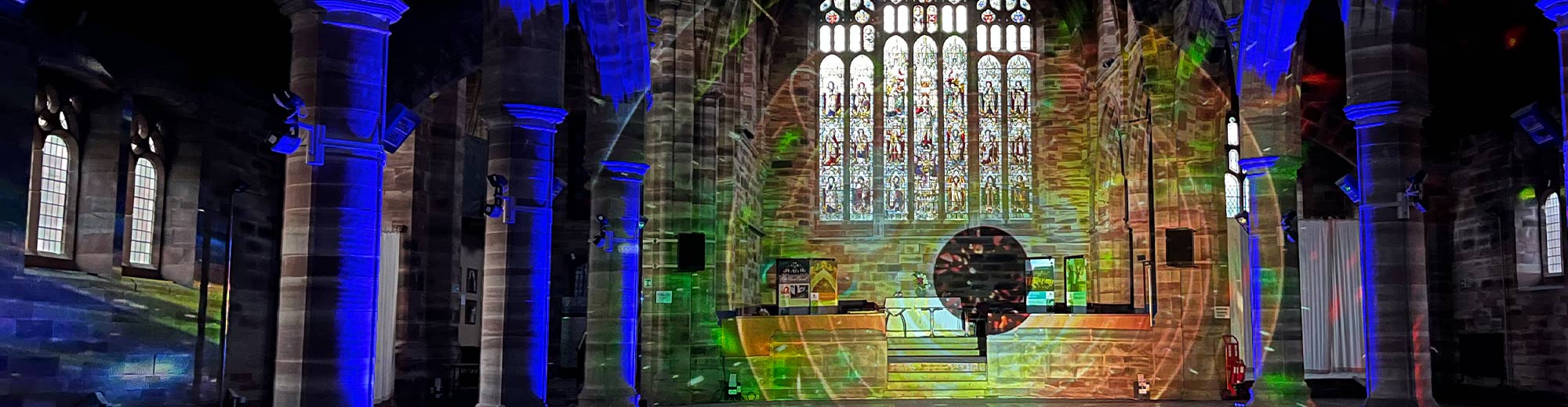 The Christie projectors were mounted on tall truss stands, provided by event production company Adlib, at about 2 meters high, and positioned so they would map onto all the church’s sandstone columns and ceiling. The accompanying lighting was made up of a primary laser, which was a 3-watt RGB run to a timecode using Pangolin Quickshow, which also ran the audio track. Two six-head, 3-watt RGB laser bars, a 2-watt RGB starburst laser and four smaller lasers were used to guide the audience around the church. The moving head and architectural lighting were controlled using an Avolites Titan One. Paul Alty also hired apprentice Josh Thornton to provide technical support, which allowed Alty to greet visitors and be more present during the experience.