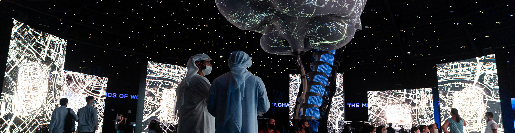 Visitors to Expo 2020 Dubai are drawn to the domed structure of the Russia Pavilion, located in the Mobility District, whose outer surface is composed of intertwined thread-like tubes of various colors. The bright colors and constantly shifting alignment of the tubes symbolize the eternal cognitive process. Once inside, the focal point of the Pavilion is “The Mechanics of Wonder”, designed and created by Konstantyn Petrov and Simpateka Entertainment Group. The installation is a massive 3D kinetic model of the human brain, rising from the floor atop of a spinal cord, and includes diodes on the ceiling and floors and screens around the perimeter of the room.