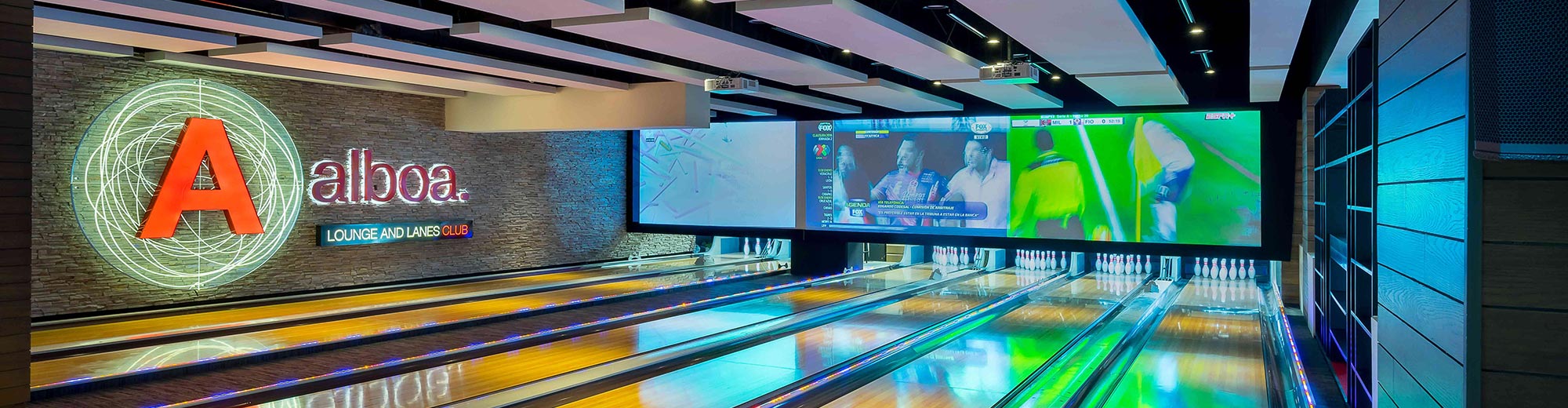 On average, every Alboa center uses five projectors to screen sports, music and entertainment as well as in the bowling area, projecting onto a single screen with a gain of 1.8.