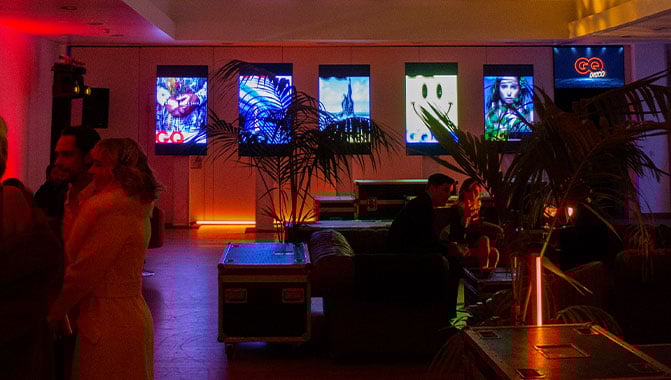 Christie Captiva DWU500S projectors enhanced the cinema room and restrooms, providing unique and immersive displays tailored to each space. Christie GS and HS Series laser projectors transformed the Disco Room and lit up a prominent tree in the garden. Additionally, Christie LCD displays were strategically placed to showcase GQ magazine covers and provide digital signage, including at the entrance to the Disco Room. These displays elevated the aesthetic and served as functional and stylish guides for the attendees.