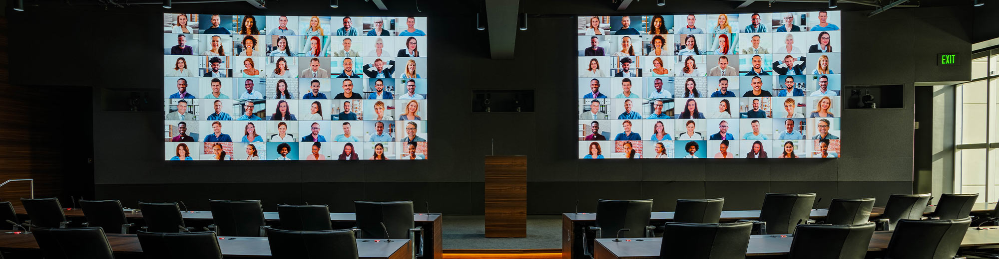Two 16-by-9-foot Christie 1.2mm LED video walls were installed with redundant Christie E600 controllers and driven by a Christie Spyder X80 image processor. With seating to accommodate 126 people, microphones were installed at each spot. Six cameras are used at the front and two in the rear of the room, in conjunction with the Spyder X80, which enables multi-window and self-configurable full auto-tracking during video calls.