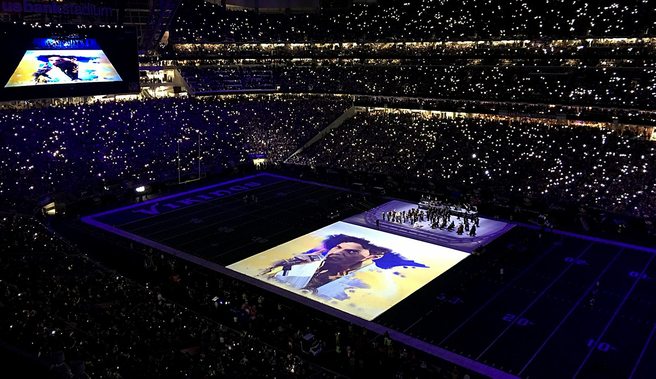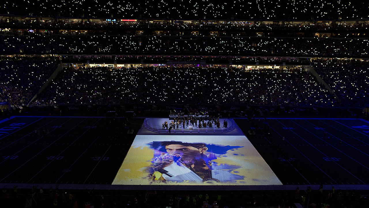 中场比赛开始时,体育场笼罩在紫色灯光之中,随后开始播放第一首音乐。 明尼苏达州管弦乐团与Prince新生代成员及Steeles福音团一同表演了已故歌手Prince的代表作——《紫雨》。