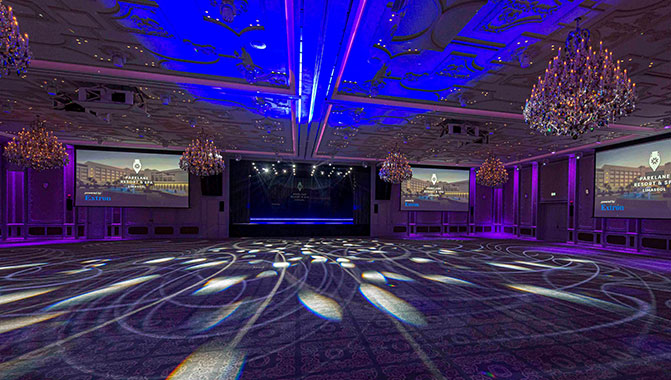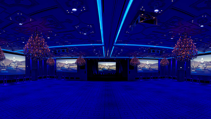 The team specified five Christie Crimson laser projectors to be used in the Diamond Ballroom – the hotel’s premier hospitality experience, housing up to 1200 guests. In the space, one projector is used to power a display in the center of the stage, flanked by projectors powering additional displays to the left and right. A further two displays are positioned further left and right of these, forming a quintet of screens arrayed in a 240-degree angle. The projectors are each housed in a unique custom scissor lift, which had to be specially designed to house the 165lb technology.