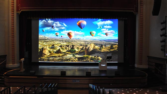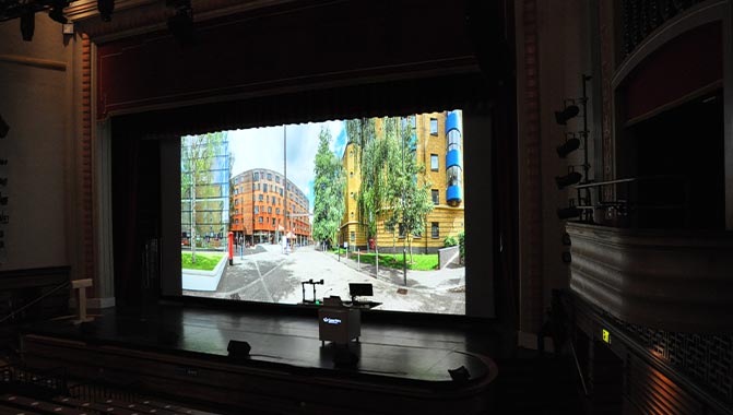 The screen is an impressive 12m by 6m (39 ft x 19.5 ft) and is located in The Great Hall, an 800-seat space in a wonderful 1930s art deco building. Queen Mary University is a Russel Group university, with more than 25,000 students, so investing in advanced technology to further their students’ learning is a key consideration. Because it is rented to large external companies as well as used for students, it is an important source of revenue and having world-class audio-visual technologies is imperative.