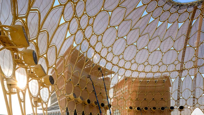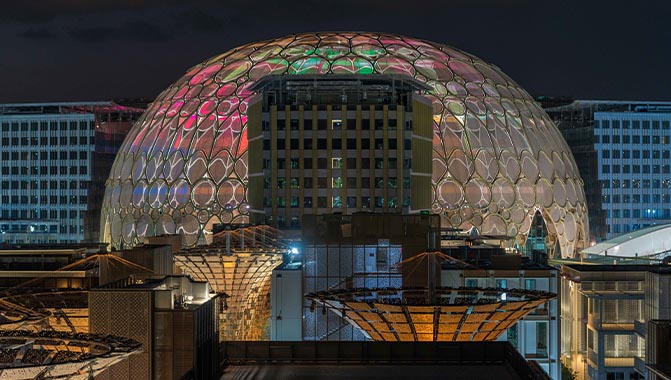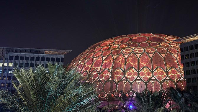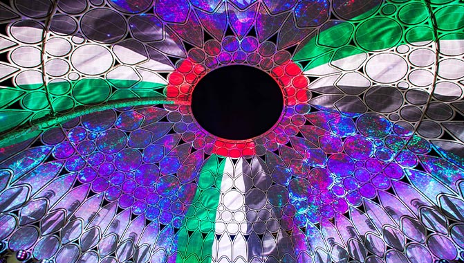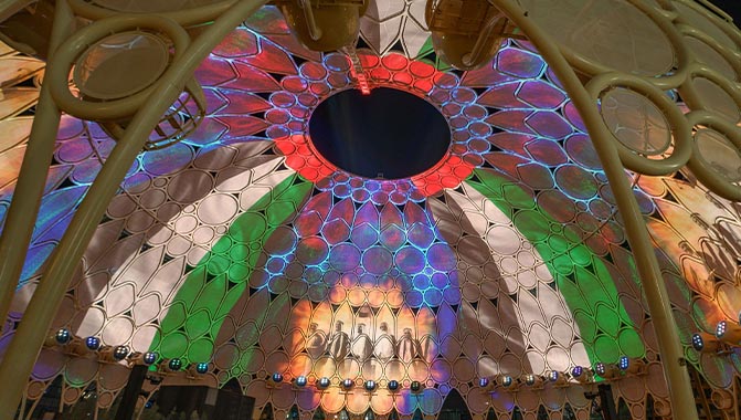 Adrian Smith + Gordon Gill Architecture (AS+GG), the firm responsible for the design of Al Wasl Plaza, approached the design with the goal of creating a powerful, immersive platform that could be used for events of all sizes. Taking into consideration the hot Dubai climate, the grand trellis design diffuses the sunlight during the day, while supporting a lush garden within the dome. AS+GG identified an opportunity to repurpose the shade structure at dusk, transforming it into an immersive experience.