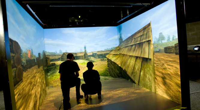 The rear-projection onto flat screens is fairly standard as it does not require complex optical correction and image blending as it would when displaying onto curved surfaces, (such as onto the old Hemispherium). Yview allows for full user interaction with the 3D virtual environment, whereas the old Hemispherium was only limited to a single user with limited means of interaction.