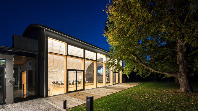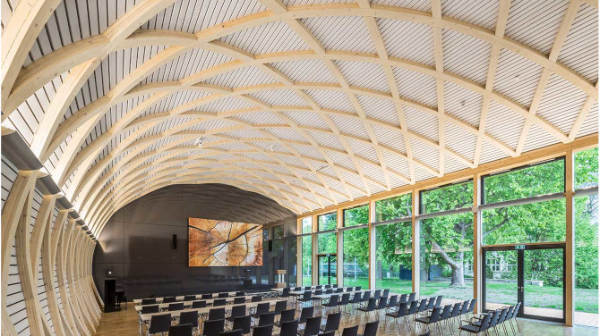When you enter the conference hall, you are immediately struck by the extravagant vaulted construction made of spruce beams laid crosswise in a diamond pattern, which dominates the 13 metre-wide auditorium and impressively demonstrates that contemporary architecture and rustic wood are no contradiction. In combination with a large window façade – without curtains or blinds – overlooking the green surroundings, the light-flooded space exudes great warmth.