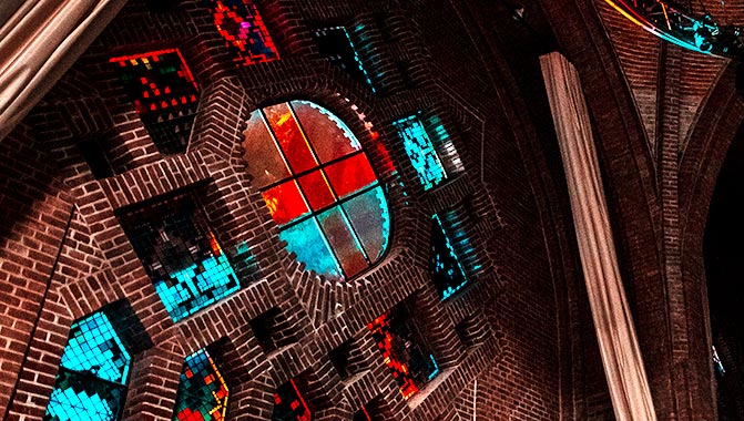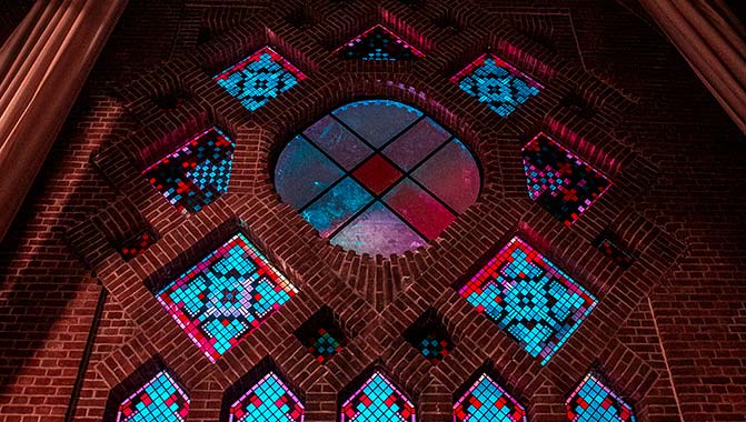 At the rear of Augustijnenkerk, the medium of light is expressed using four 20,000 lumens Christie HS Series projectors with the mapping focused on the three sets of iconic stained glass that form the façade of the building, providing a unique effect. The striking architecture – combined with the vibrant mapping performance – depicted humanity’s inner faith. “New to this project was the combination of light coming from inside to out (of the buildings), and a projection on the outside,” says Ronald Romakers, director of GLOW. “In the early days it was impossible to do that, but with these powerful Christie projectors, it works.”