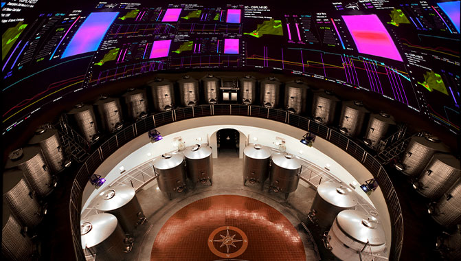 为了让酿酒师团队更好地掌握这些信息,实现发酵过程的里外协同,帕尔马兹酒庄决定将这些海量数据投影到发酵室天花板上,而不是局限在平板电脑或台式机的应用程序中。