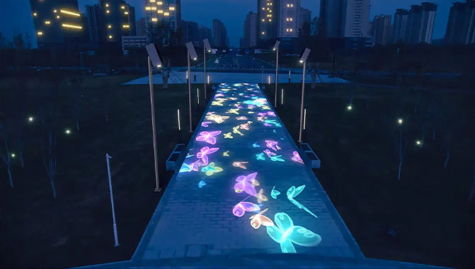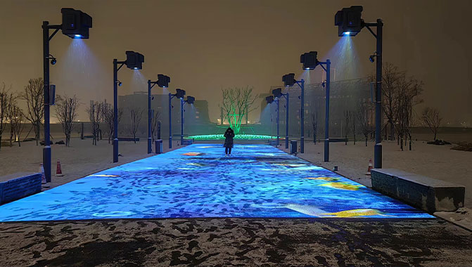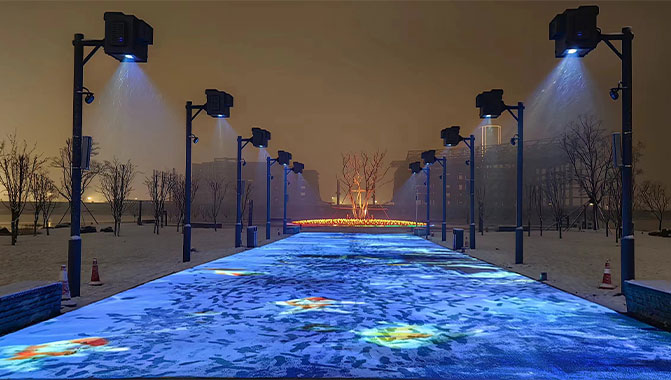 这个位于伊滨区中轴带智慧化建设项目的崭新照明项目旨在为游客提供令人兴奋的夜游体验。该地面投影部分由科视Christie 的合作伙伴北京光影创意科技有限公司负责设计、投影机选型、安装调试施工、互动内容制作以及后端的控制。北京光影创意科技团队战略性地安装了十多台科视Christie LWU1260-DPS 激光投影机,打造出具有互动元素的迷人地面投影。