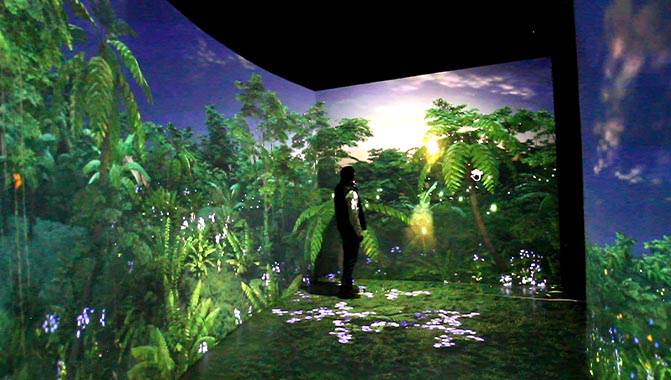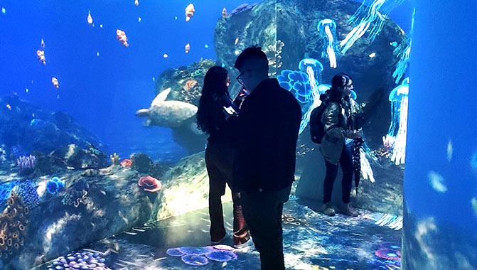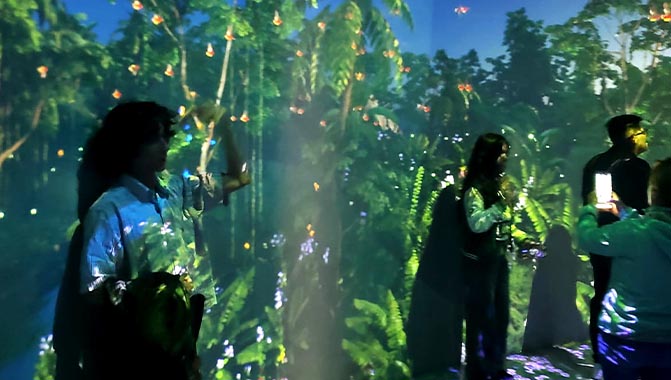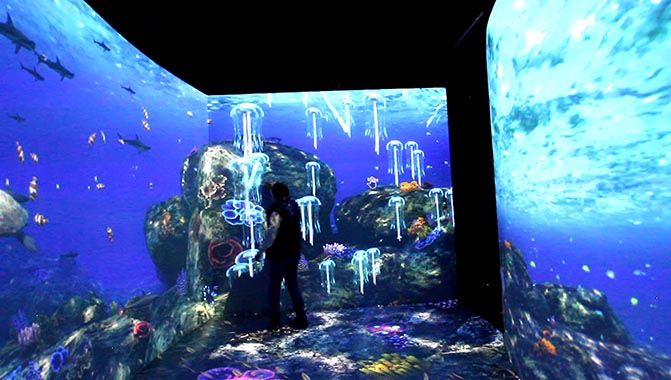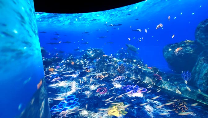 The content, powered by Unreal Engine, is generated in real time and enhanced with LIDAR sensors that track audience movement to trigger interactive reactions such as startled fish, pulsating jellyfish, or blooming flowers.