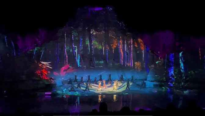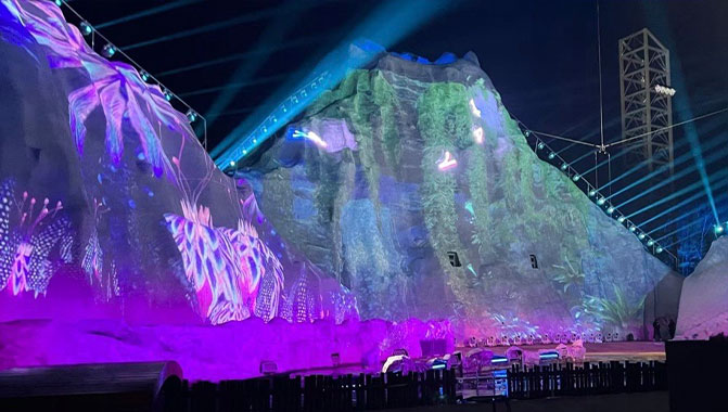 这场演出在山体、地面和水幕等各种表面上进行了大规模投影。巨大的投影区域长达 80 米,高 25 米,这就要求科视Christie DWU19-HS 投影机所具备的高精度和高灵活性。