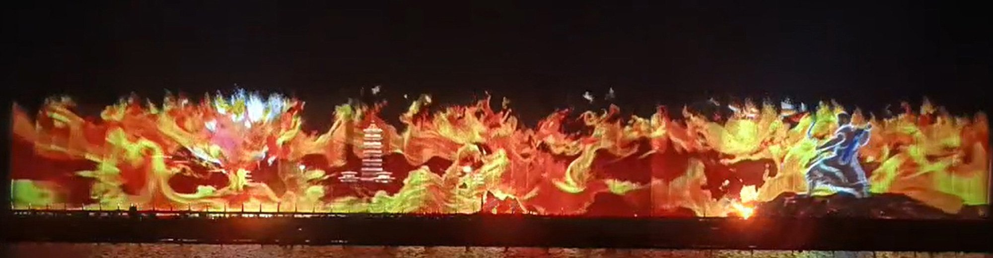 北京中清未来科技有限公司供应并安装的 10 台科视Christie Crimson WU32 激光投影机,共同构筑起18米高的巨型水幕,为震撼人心的叙事提供出色载体。在这片虚实相生的浩瀚水域间,观众将沉浸于后羿射日、精卫填海、夸父逐日、大禹治水等经典神话场景。这些沉浸式投影勾勒出巍峨山河的磅礴气象,带来震撼心灵的视觉体验。