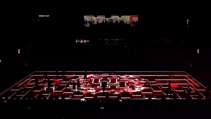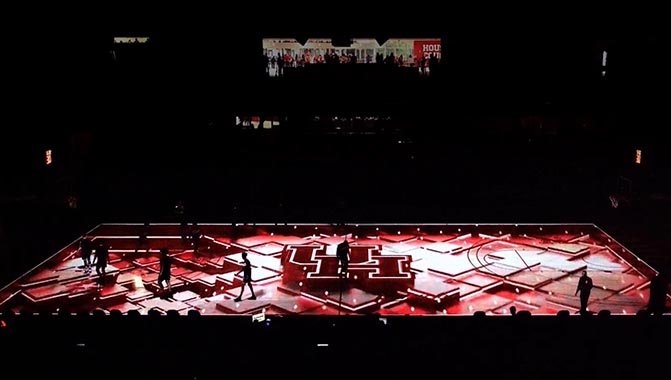 HOUSTON, Texas – The University of Houston recently updated the projection mapping content for its basketball team, the Houston Cougars, creating a dramatic, on-court pre-game show at the Fertitta Center. The bright, 3D graphics were created by Quince Imaging, and enabled by a range of Christie® solutions installed by Quince, including 3DLP® projectors, Mystique™, a Pandoras Box® Server, and Terra®, an AV-over-IP system.