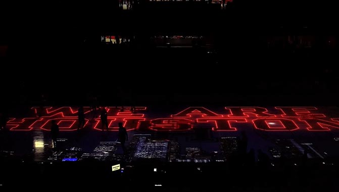 The projection mapping system, installed in the Fall of 2018, uses eight Christie Boxer® 4K30 3DLP® 30,000 lumen projectors, a Pandoras Box Server, Terra and Mystique. Says Gazzillo of the decision to install an all-Christie system in the arena: “Having a complete Christie solution allows us to simplify workflows. It’s one of those things that we’ve really encouraged pre-COVID, and now during COVID, it has become even more important to have an integrated system of projectors, control and transmission that allows us to maintain it so much more efficiently remotely, when you can’t have full staff on site.”