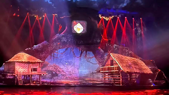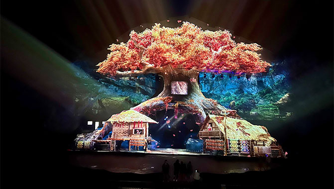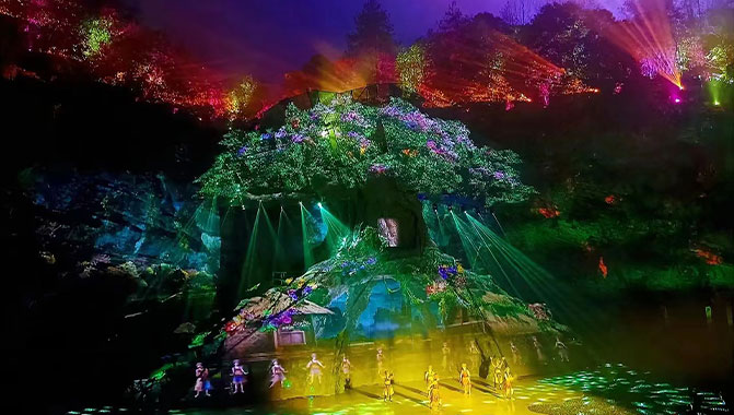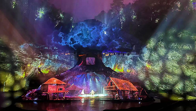 Housed in weatherproof enclosures overlooking the stage areas, the projectors deliver vibrant images at several performance venues that are interconnected via plank roads, including the massive Hibiscus tree and enchanted forest. “These sites represent the harmonious coexistence of nature and life depicted in ancient poetry, and they are vividly brought to life using a variety of advanced technologies including 3D projections, lighting, holography and water effects to create a stunning multisensorial experience that accentuates the timeless beauty of the Jiuge-Shangui scenic area,” Li added.