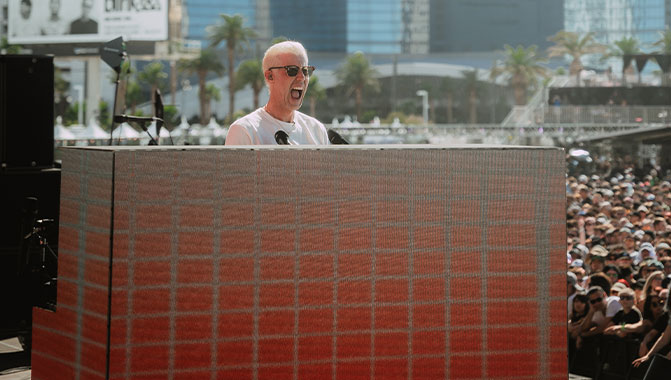 LAS VEGAS – (November 15, 2023) – Christie® MicroTiles LED® took the stage with Something Corporate during the band’s headlining reunion show at Las Vegas’ House of Blues on October 20, and their main stage performances at the Las Vegas Festival Grounds on October 21 and 22 as part of the When We Were Young festival. Vocalist and pianist Andrew McMahon performed on a piano fully wrapped in Christie MicroTiles LED, which displayed images and lyrics from the band’s beloved catalog. Kevin “Clutch” Page, principal, Procraft Media, who is also the bassist in Something Corporate, led the integration of this one-of-a-kind project.