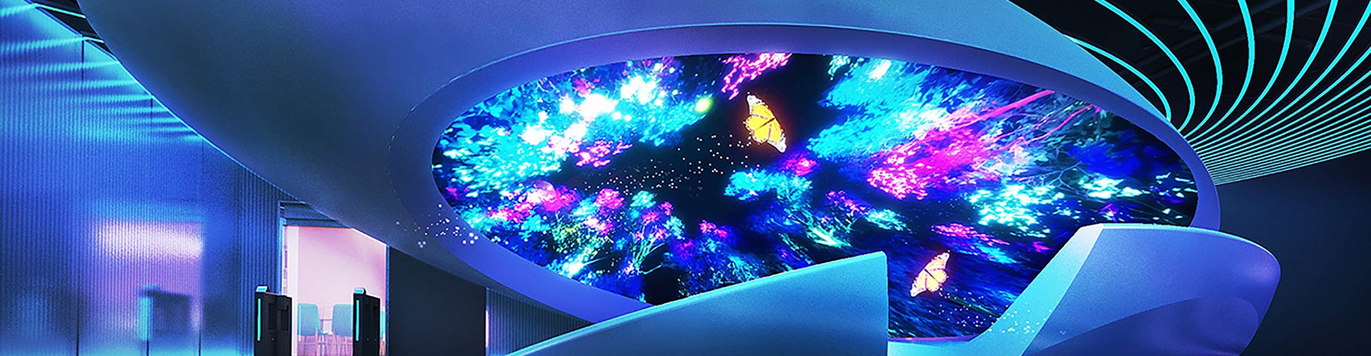 “Surround(环绕)”展区是一个半球和圆柱形组合空间,将海洋与空间融为一体,旨在唤起多种感官。游客可以欣赏到整个宇宙的奇妙景观、清澈透明的蓝色海洋,而绚丽的晚霞则灵动地充满房间。巧妙安装的八台科视Christie 4K7-HS 和 DWU960-iS 激光投影机将游客带入梦幻世界,探索以壮丽的天空和水下世界构成的超现实场景,提升了整体体验。
