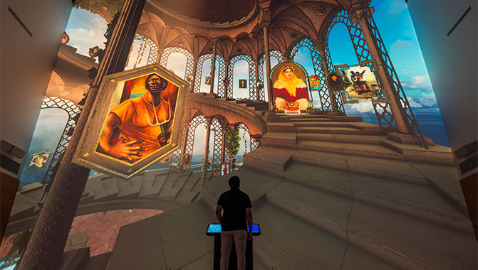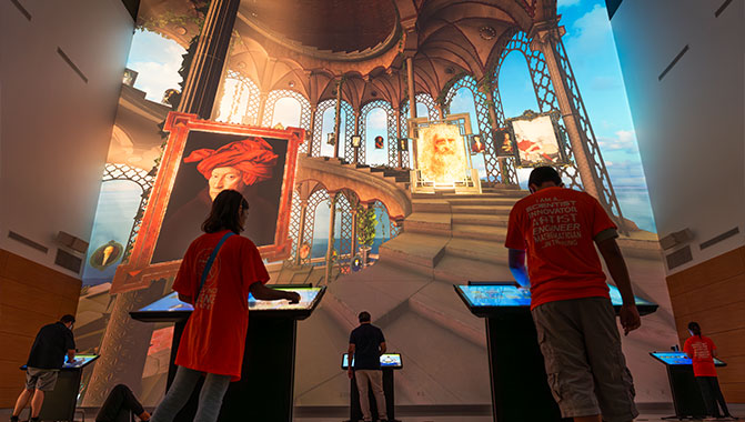 In 2021, the science center approached Ideum with a vision for Curiosity Hall, an immersive and participatory theater planned for its new downtown location. “The intent of the theater is to focus on inspiring the curiosity of da Vinci in the three major fields of his study: art, engineering, and the human body,” explains George Hardebeck, director of media systems, Ideum.