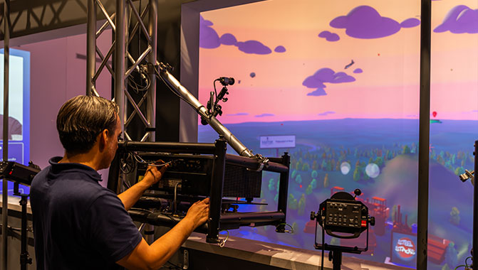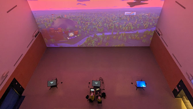 Ideum used the M 4K25 RGB projectors to cover three-quarters of the large surface and used the DWU1100-GS projectors to focus on a smaller section of the surface. This allowed Ideum to expand the projection surface from the original 48 feet to 58 feet and have a higher PPI [pixels per inch] at the floor.