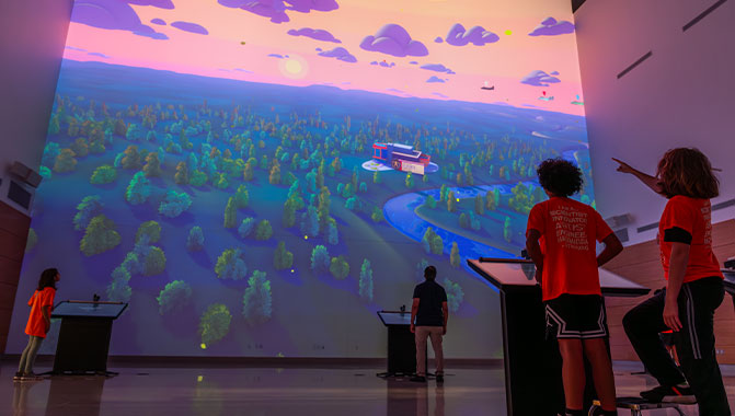 With the goal of sparking curiosity amongst its guests, Ideum worked with the science center and planning and design-build firm Roto to create a program that would resonate with visitors. “From there, we designed a technical platform and the infrastructure to support not only the projection screen but also the nine Ideum 43” Drafting II kiosks that allow the audience to create characters for the immersive worlds. We also designed the network infrastructure to support this technically complex system,” says Hardebeck.
