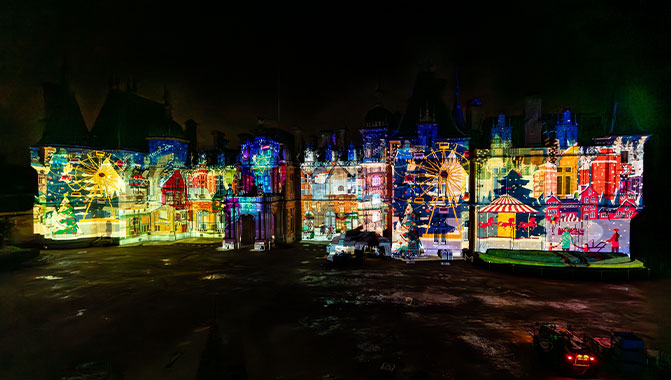 WOKINGHAM, England – Christie® HS Series projectors powered a sparkling seasonal projection mapping experience at Waddesdon Manor, a 19th century Grade 1 listed National Trust site in Aylesbury, Buckinghamshire. Yes Events deployed 11 Christie DWU23-HS 1DLP® laser projectors – supplied by Christie partner A.C. Entertainment Technologies – to map the stunning 10-minute content designed by mapping expert Jamie Shiels. The content, inspired by the festive season and popular children’s books, was projected onto the façade of the French Renaissance-style Loire chateau for festive revellers to enjoy as part of a ‘Christmas at Waddesdon’ experience.