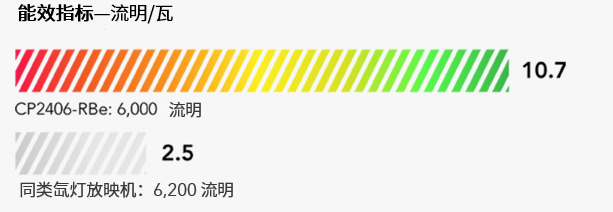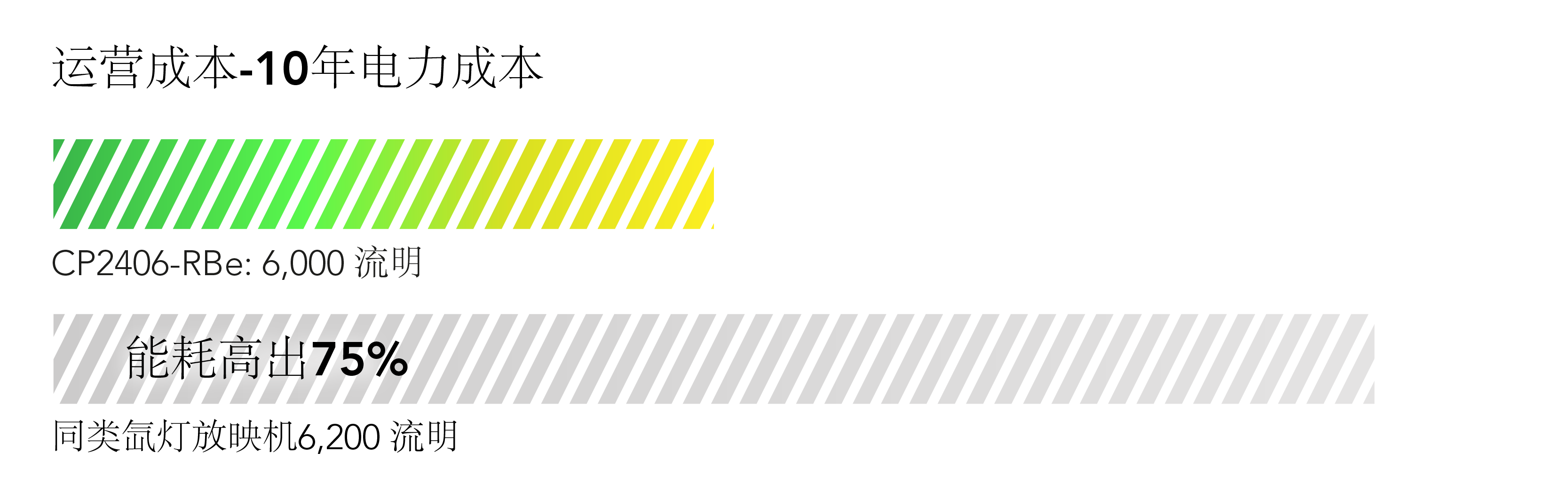 CP2406-RBe 能效比同类氙灯投影机高 292%,每瓦可产生 9.8 流明亮度。能耗更低,总拥有成本减少 75%。