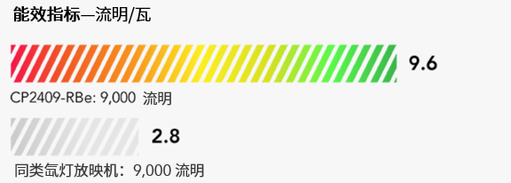 CP2409-RBe 能效比同类氙灯投影机高 236%,每瓦可产生 9.4 流明亮度。能耗更低,总拥有成本减少 70%。