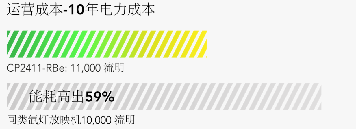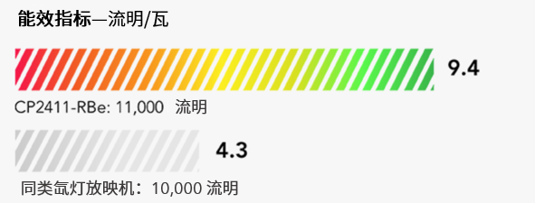 CP2411-RBe 能效比同类氙灯投影机高 170%,每瓦可产生 8.9 流明亮度。能耗更低,总拥有成本减少 59%。
