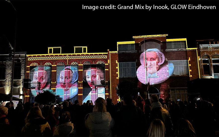 Ending the year was GLOW Festival in Eindhoven, where we supported three artists with solutions that included RGB pure laser projectors, Pandoras Box, and Terra®. Working with our partner Sahara Benelux, digital design agency Inook transformed Wilhelminaplein with projection-mapped faces from the Rijksmuseum collection of art, and artists Dirk van Poppel and Michel Suk lit up three trucks with trailers in a tribute to the local DAF factory. Lastly, students from Design Academy Eindhoven transformed an outdoor space into a fictional company that blurred the lines between fiction and reality.
