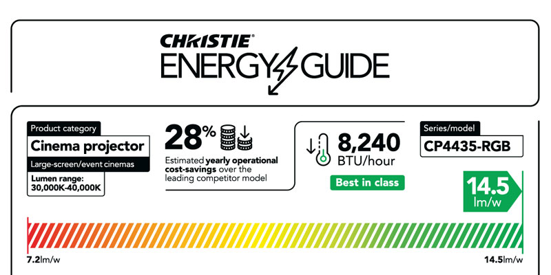 Every Christie cinema projector has an energy guide that specifies lumens per watt, BTU per hour, and estimated yearly operational cost-savings.
