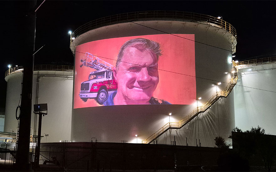 The outdoor nature of the project and the tank’s cylindrical shape posed significant challenges. “The cylindrical surface required extensive pre-construction engineering and modeling to ensure the projected artwork stayed true to the artists’ original intent,” explains Linney. Using Christie’s advanced optical lens tilt-shift and digital adjustments, Pro AV Solutions achieved a planar visual effect, delivering a seamless display on the tank’s curved structure.