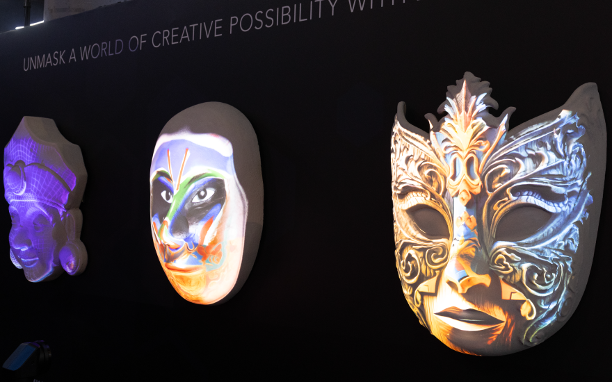 我们展位上最受欢迎的体验之一,是三款面具上的互动投影映射展示。参观者受邀参与内容创作,为威尼斯面具、印度面具或中国戏曲面具设计投影图案。全新 Korus 系列 4K 1DLP 投影机与 Ross Video 媒体服务器携手,为三款面具注入斑斓色彩,使其栩栩如生。
