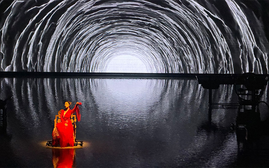 A major highlight of the “Dream of the Red Mansions Chapter 33 Theatre” is an engaging reenactment of one of the novel’s most memorable scenes. The narrative unfolds on a massive, three-sided gauze screen that’s illuminated by a Christie DWU1400-GS projector on each side. The images they displayed were juxtaposed with live actors behind the screen.